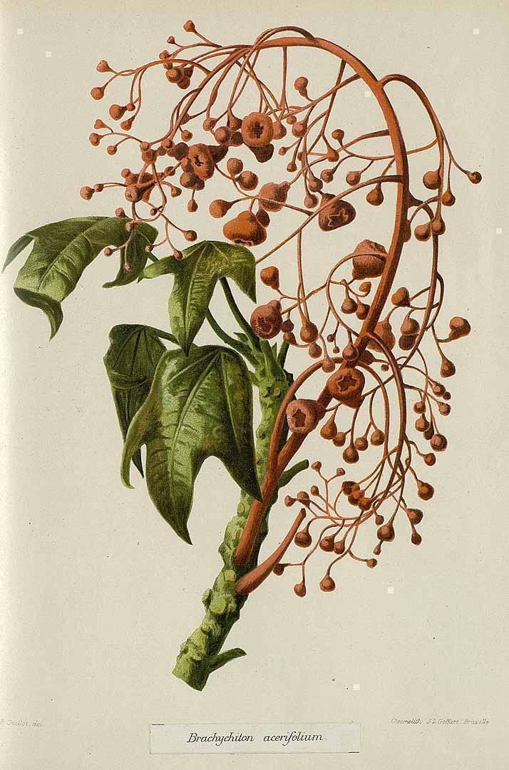 MalvaceaeComo otros árboles del género, es una especie australiana, concretamente de la costa Este de Australia desde Nueva Gales del Sur hasta Cabo York, Queensland. Brachychiton deriva del griego brachys, "corto" y chiton, "cubierta", aludiendo al recubrimiento de sus semillas. El epíteto específico acerifolius alude a sus hojas, similares a las del Acer saccharum, un arce, aunque en realidad tiene una gran variabilidad en la forma de sus hojas, que pueden ser desde enteras, especialmente en ejemplares adultos, a lobadas con entre 3 y 7 lóbulos.