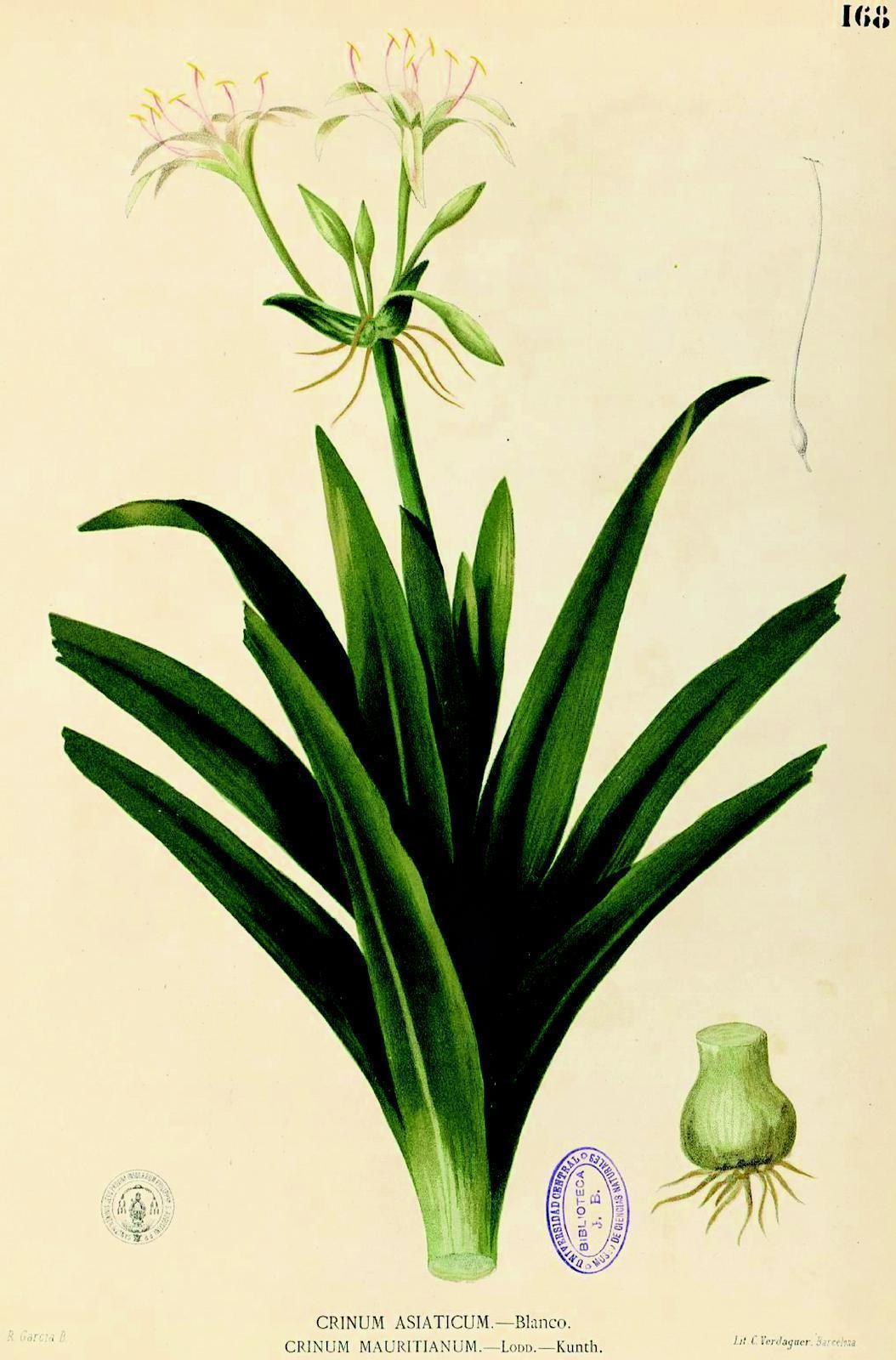 AmaryllidaceaePlanta tropical de origen asiático y también presente en varias islas del Pacífico y Australia, donde crece a la orilla de cursos de agua, en los manglares, arenales y sotobosque de selvas húmedas. Está muy extendida en jardinería por sus grandes hojas verde oscuro y sus flores parecidas a los lirios, y que se encuentra también naturalizada en Madagascar y las costas del Golfo de México y el Caribe. De hecho el género toma su nombre del griego krinon, que no es sino el nombre del lirio.
