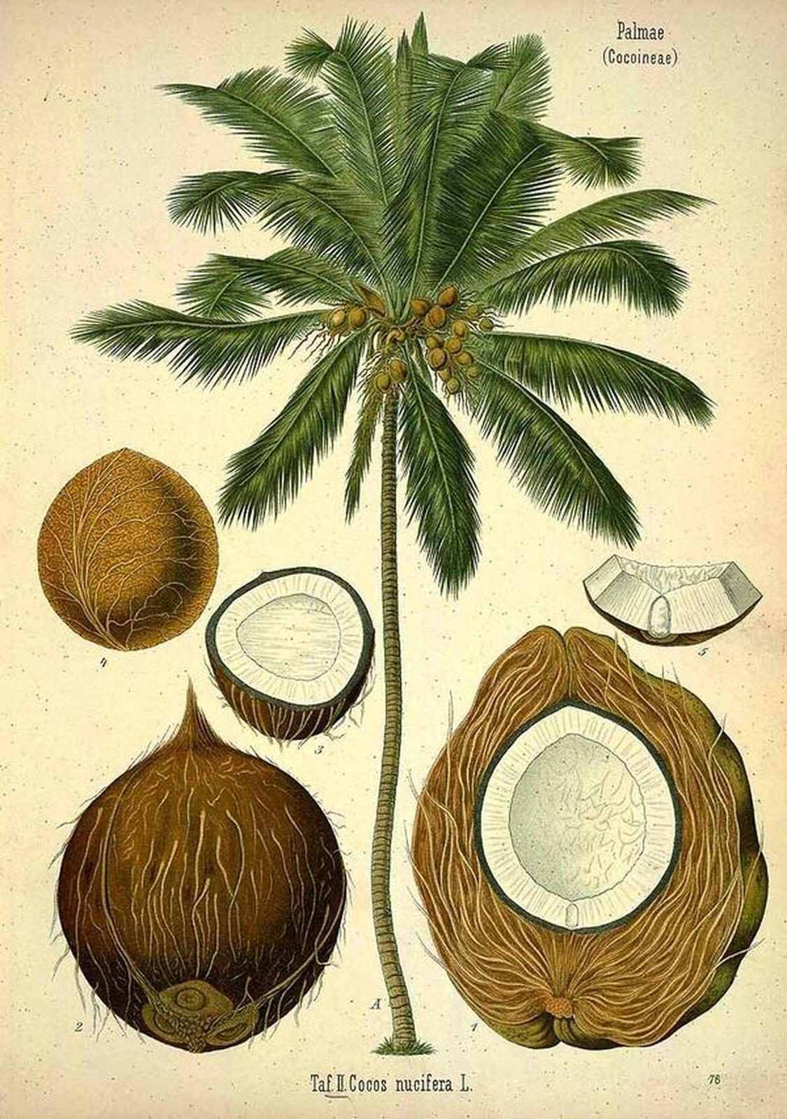 Su semilla, el coco, está considerada como la mayor semilla de la naturaleza, y es la clave de su éxito: flotando por los mares sin perder su capacidad de germinación, se ha expandido por los trópicos de todo el planeta. Usado como alimento, Antonio Pigafetta destaca también del coco el uso, entre los nativos de Filipinas, de su aceite mezclado con ajonjolí, para pintarse y engrasarse el cuerpo con el fin de preservarse del sol y del viento, en lo que sería una aromática crema de protección solar. El vocablo coco que usa Pigafetta era no obstante ya frecuente entre portugueses y españoles porque es de hecho de origen portugués. Parece que fue inventado durante la expedición de Vasco de Gama que llegó a la India en 1498. Los portugueses que llegaron a esas tierras le pusieron a la gigantesca semilla ese nombre porque se asemejaba a una cabeza humana, deforme eso sí, como debiera ser la cabeza de ese monstruo que según el folclore popular asustaba a los niños: el coco. Pigafetta, con fecha de 18 de marzo de 1521, da además una expresiva descripción de los cocoteros y sus virtudes, afirmando que “se parecen a las palmeras que dan los dátiles, aunque sus troncos, sin poseer tan gran número de nudos, no son tampoco bien lisos. Una familia de diez personas puede mantenerse de dos cocoteros, practicando alternativamente cada semana las incisiones en el uno y dejando reposar al otro, a fin de que un derrame permanente del líquido no le seque haciéndoles perecer. Se nos ha dicho que un cocotero vive un siglo entero". Y casi cien años parece que vivieron de hecho los cocoteros plantados por los Montpensier en los jardines del Palacio de San Telmo, que murieron durante unas heladas de mediados del siglo XX, ya que el cocotero es una palmera de clima tropical que no soporta las bajas temperaturas fuera de esa región del globo. Una planta que, no sin razón, sigue asociándose en el imaginario colectivo con el paraíso tropical.Procedencia